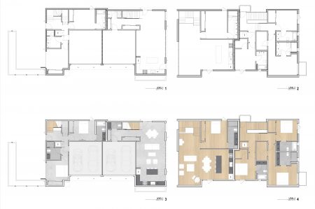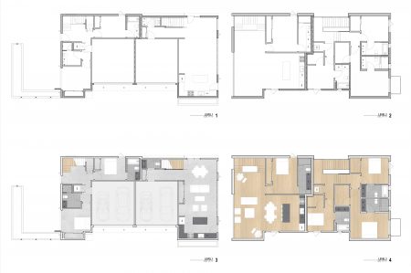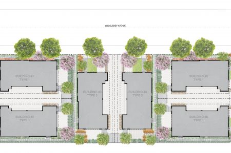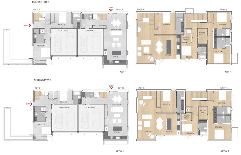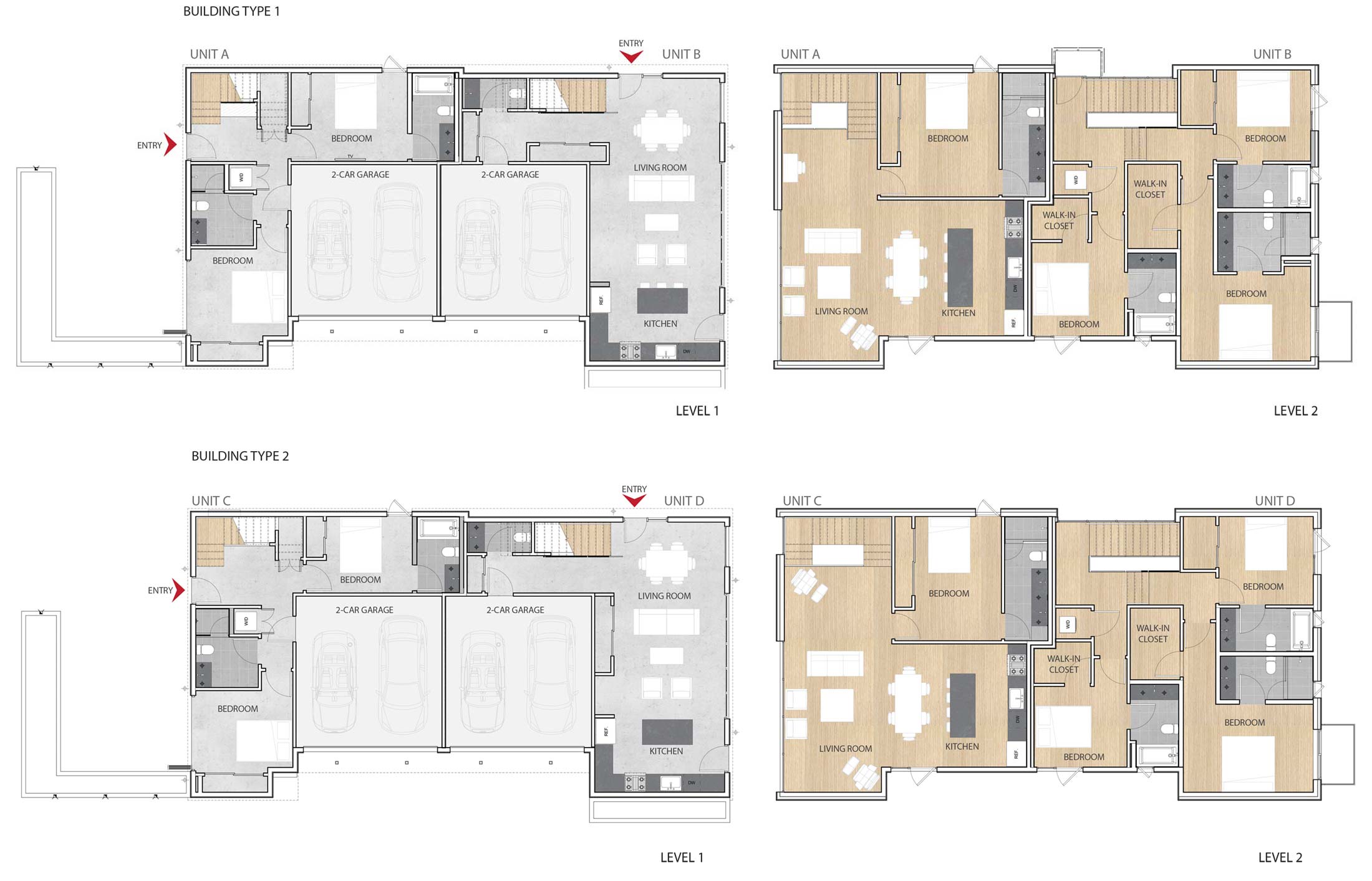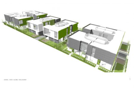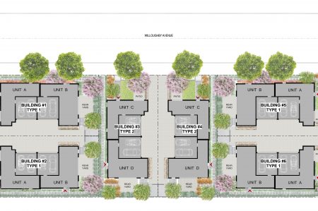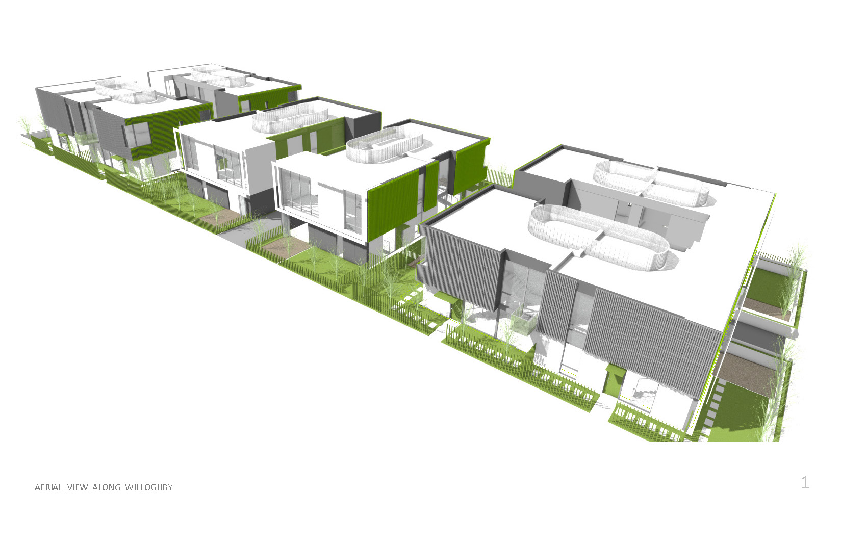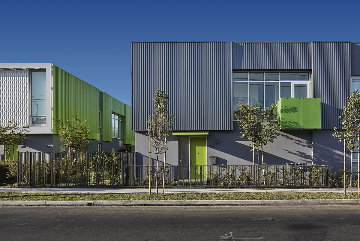The Willoughby Duplexes encompass an entire block near the La Brea Corridor. This complex is consciously designed to create a “village-like” feel, with six two-story residences oriented in pairs with intersecting circulation and landscaping to create flow and green-space. Each pair of buildings has individual entries and driveways creating a connective opening between the residences. The duplexes are wood-framed and arranged in two alternating 3-bedroom layouts, with the living quarters on the second floor in one orientation, and on the first floor within the other.