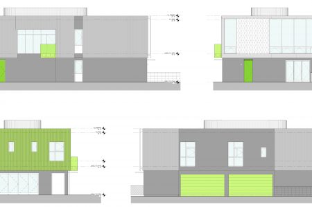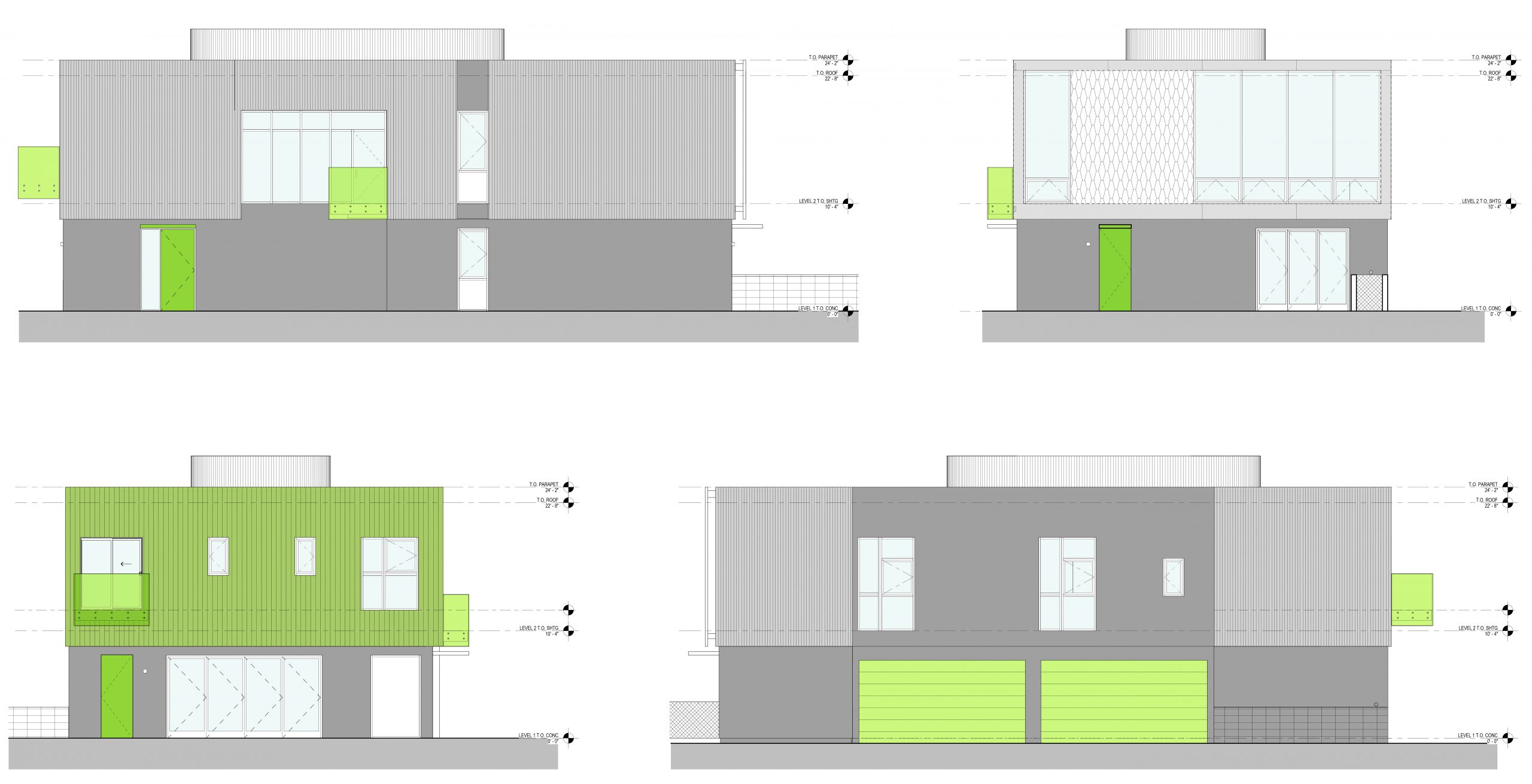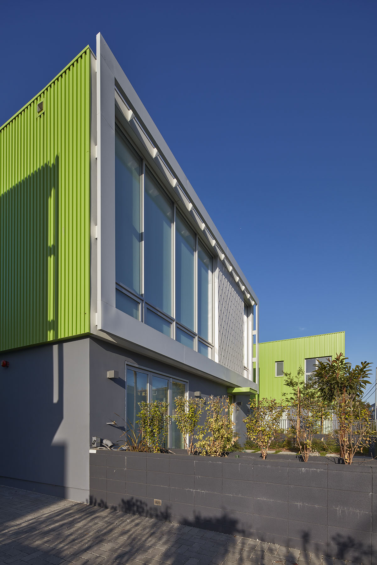 The corrugated metal panels painted a bold and fresh acid green complements the vitreous glass and tile texture, giving each residence a unique pallet within their respective orientations. Each unit’s individuality is emphasized by its position on the site and layout within, thus creating privacy for each unit and fully utilizing the extents of the entire development. The Willoughby Duplexes offers a unique solution to composing and celebrating multiple duplex development in the urban environment.