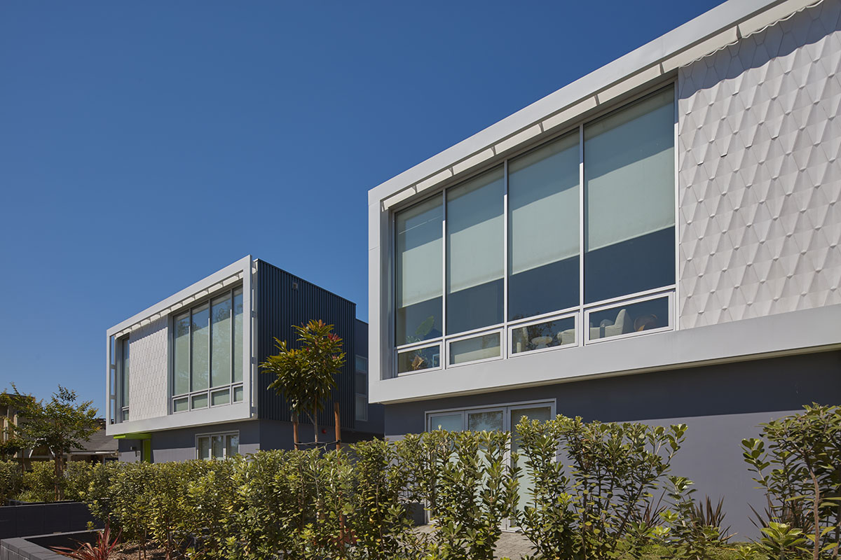 A 13-foot tall façade of glazing and condition-specific custom fabricated scalloped tiles celebrates the duplexes’ exterior. The scalloped tiles are oriented within a steel frame clearly defining the main living-quarters of each street-facing residence. These frames are “floated” off the main volume through the use of standoffs, and the orientation allows for steady airflow across the façade and the projection of varying shadows throughout the day. This design brings a clean industrial feel to the outside and breaks up the larger floor-to-ceiling windows that make up the living quarters.
