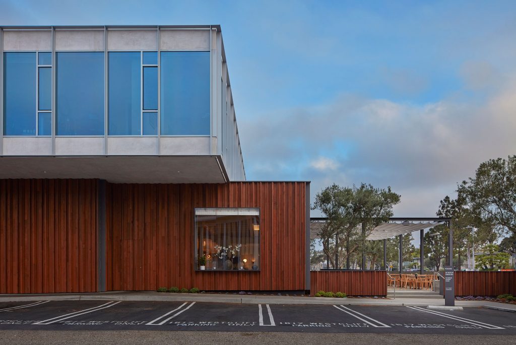 A complete facade renovation was undertaken through a “reskin” of the existing office shell, replacing it with three different storefronts and a curtain wall glazing system with varying colors. Solar louvers on the south facade help to reduce solar gain further. A fritted glass panel facing Westcliff Drive signifies the main entrance with a cedar storefront and large display windows enhancing public access and visibility.
