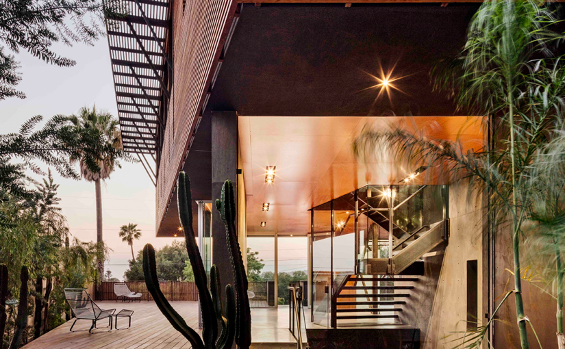“The Client knew he needed a creative solution for the awkward site, which had several zoning restrictions; he also wanted something that was open and naturally ventilated, craftsy yet contemporary, and that reflected his own minimalist design aesthetic. The couple reached out to Shubin Donaldson, a local firm known for its sleek Southern California houses and commercial interiors.”